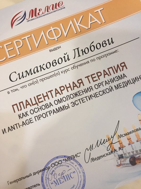 Профессиональная переподготовка : ГБОУ СПО МУ № 21 Сертификат 009290 от 12.12.2012 по специальности «сестринское дело в косметологии» . НО организации дополнительного профессионального образования , диплом у2020001390 от 09.01 2020, Школа Главной медсестры.